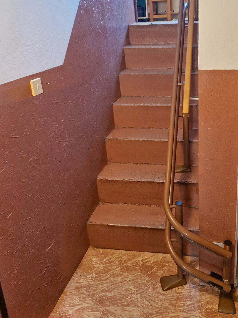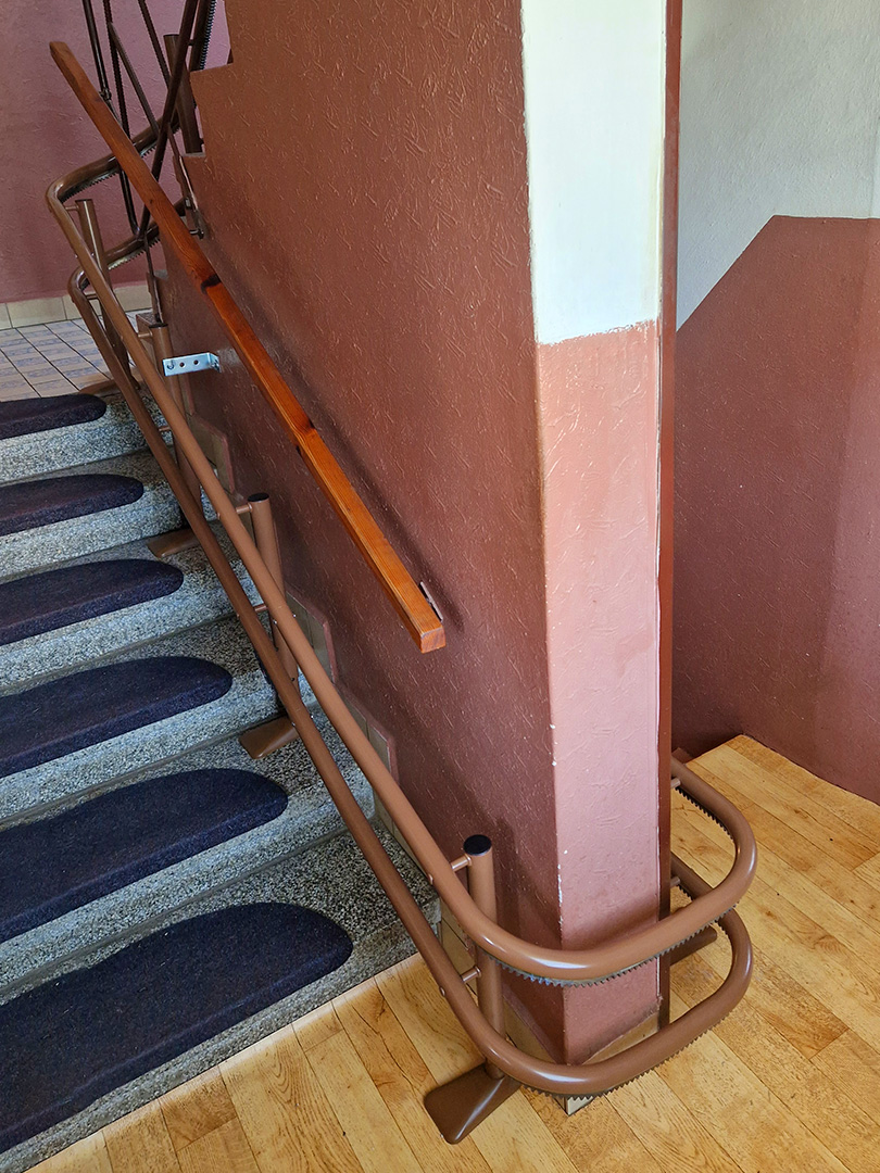 V rodinném domě v Kaplici jsme realizovali instalaci schodišťové sedačky Handicare 4000, která spojuje sklep, přízemí a patro. Celkově tak sedačka překonává dvě podlaží a čtyři schodišťová ramena.