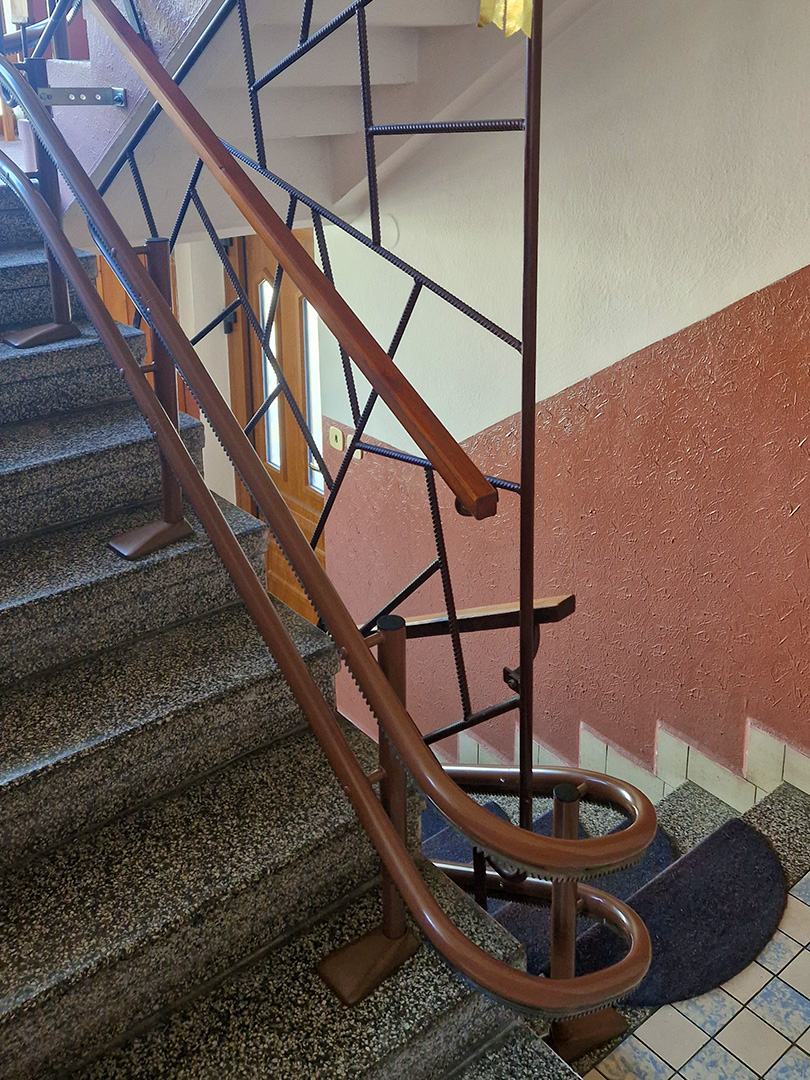 První schodišťové rameno bylo velmi úzké, proto bylo nutné provést úpravu zábradlí.
