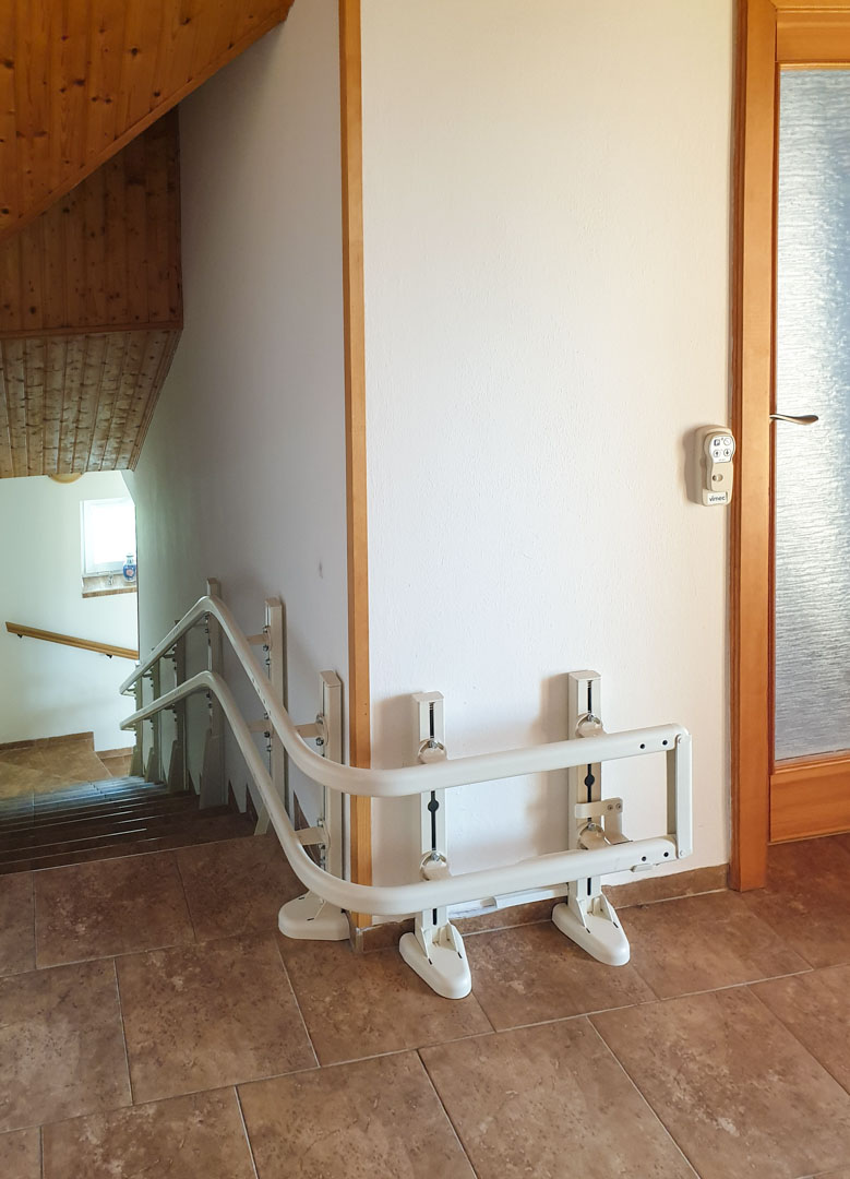 Schodišťová sedačka V 59 Dolce Vita si poradí i s takto komplikovaným schodištěm, kdy část je přímá, část točitá a sedačku je potřeba parkovat za rohem.