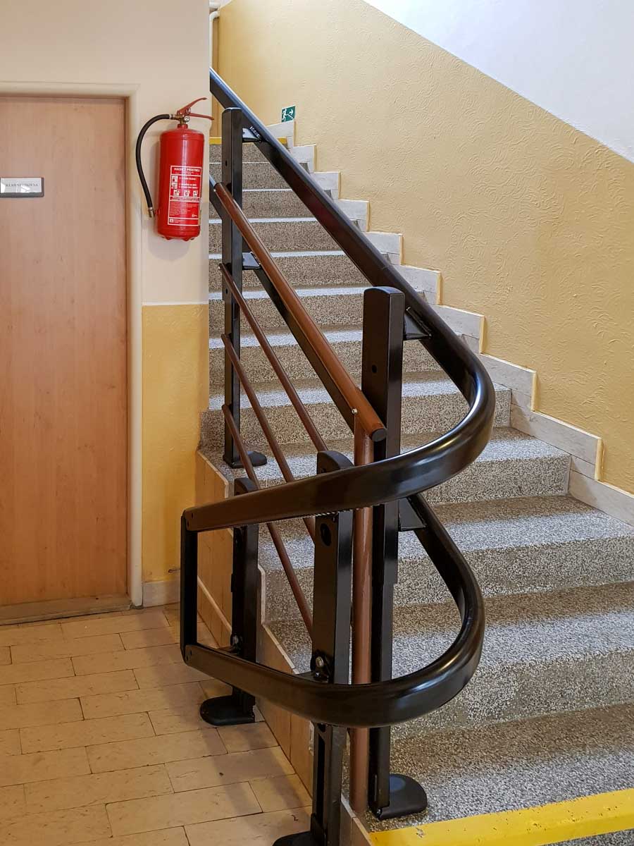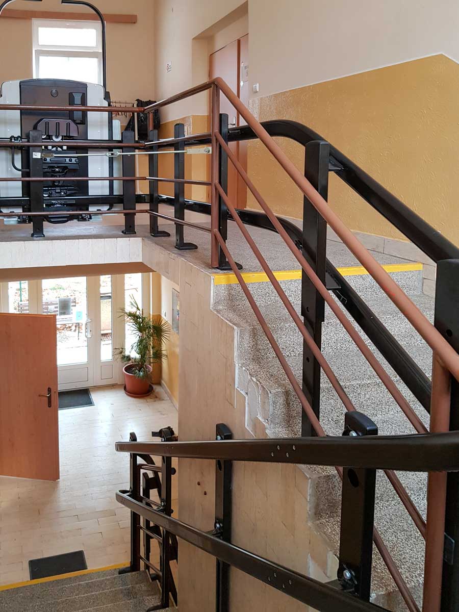 Pojízdná plošina pro vozíčkáře i kočárky umožňuje bezbariérový přístup ve veřejné budově. Díky ní je zpřístupněna jednací místnost na úřadě, která je umístěna v patře nad točitým schodištěm.